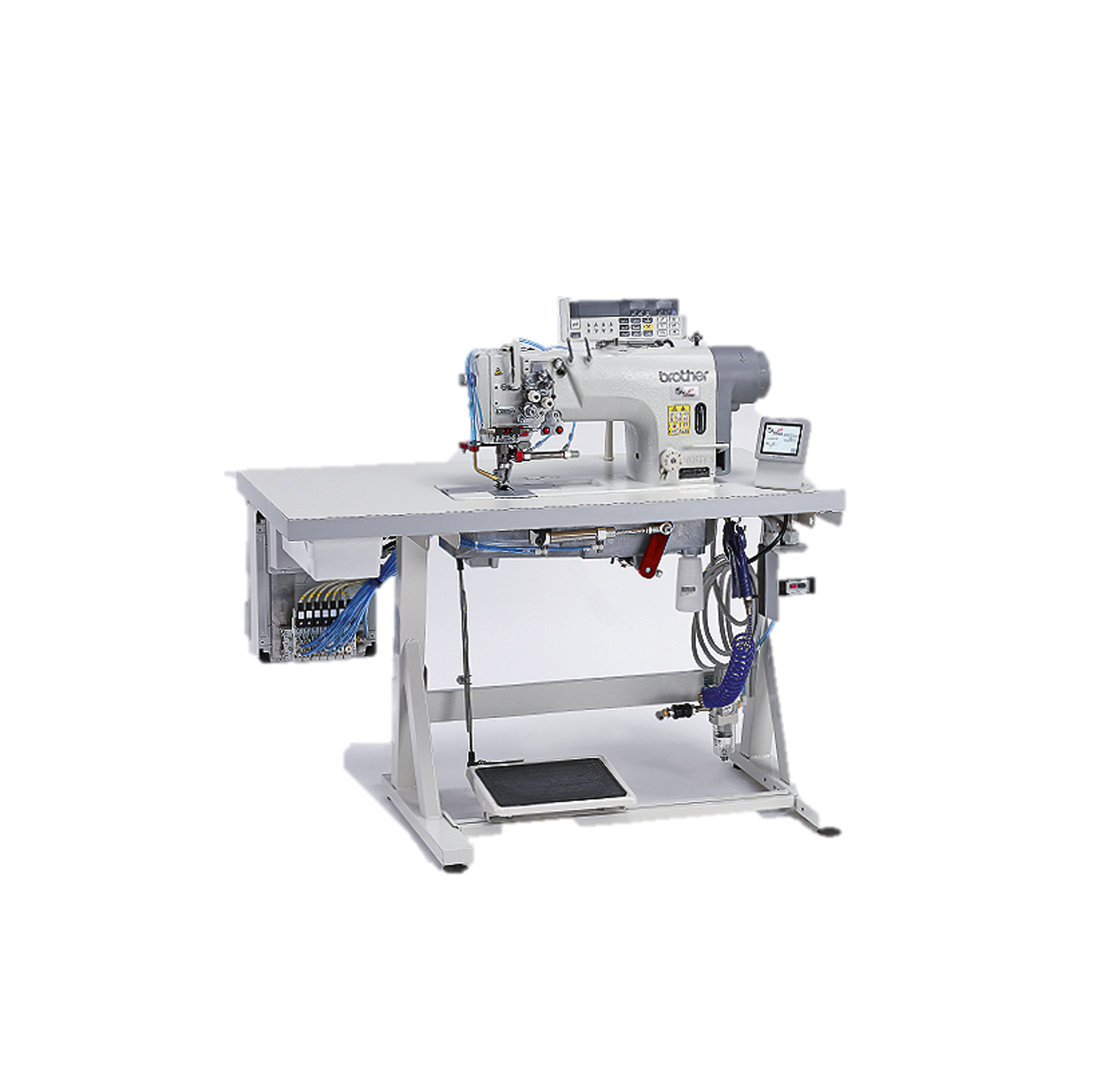 Unit for Application of Second Facing and Sewing Front Panels with Sewing Head Brother Large Hook Equipped with Special Foot and Wiper. This unit is Complete with PLC and Interative Display that Allows to Set a Seam Sequency Up to Four Seams and Corner Stitching