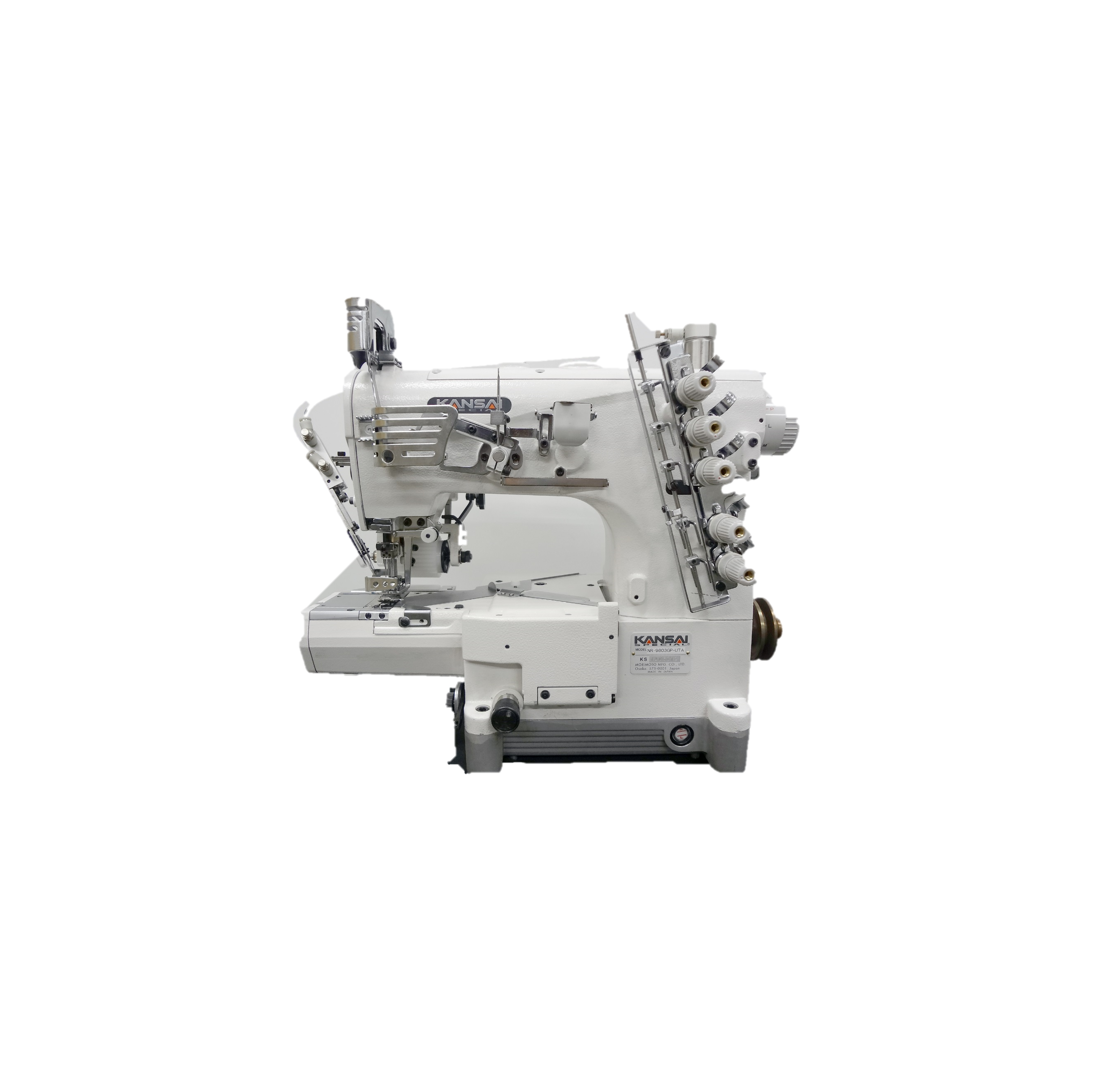 NR9803GPEHK-UTA | 3 Needle, Cylinder Bed Machine with Fabric Trimmer and Smooth or Gear Puller for Attaching Preclosed Elastic to Men’s Underwear with Under Thread Trimmer and AC Servo Motor |